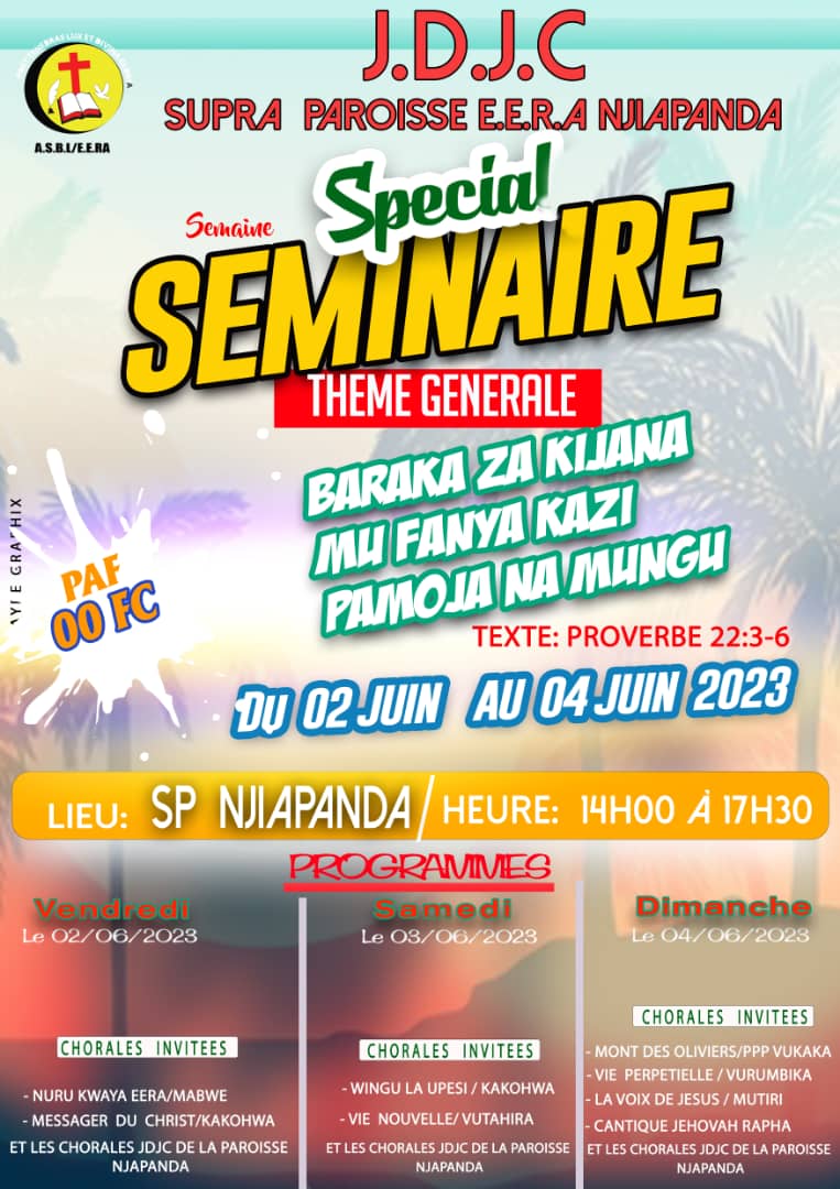 Le service des Jeunes disciples de Jésus Christ (JDJC) de la supra-paroisse Nziapanda de l’Eglise évangélique du rite africain (EERA) en ville de Butembo (Nord-Kivu) annonce pour ce vendredi 2 juin, le début d’un séminaire évangélique de trois (3) jours, organisé à l’intention des jeunes chrétiens. Ce séminaire sera clôturé le dimanche 4 juin.