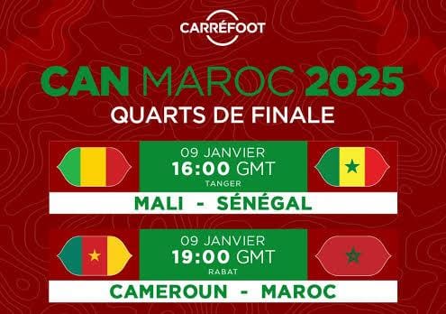 Pour rappel, le Cameroun s’est qualifié pour les quarts de finale après sa victoire (2-1) face à l’Afrique du Sud. L’Égypte, de son côté, a battu le Bénin (3-1). Le Nigeria s’est largement imposé face au Mozambique (4-0). L’Algérie a éliminé la RDC (1-0) dans les dernières minutes de la prolongation, tandis que la Côte d’Ivoire, tenante du titre, a dominé le Burkina Faso (3-0) lors des huitièmes de finale.
