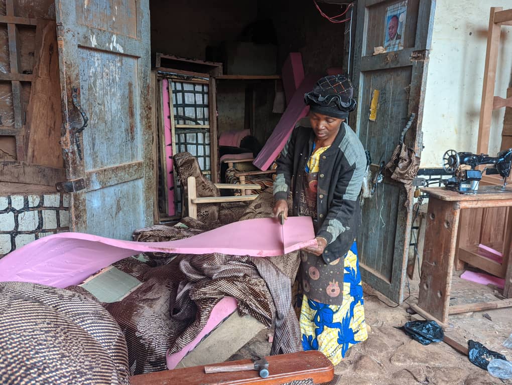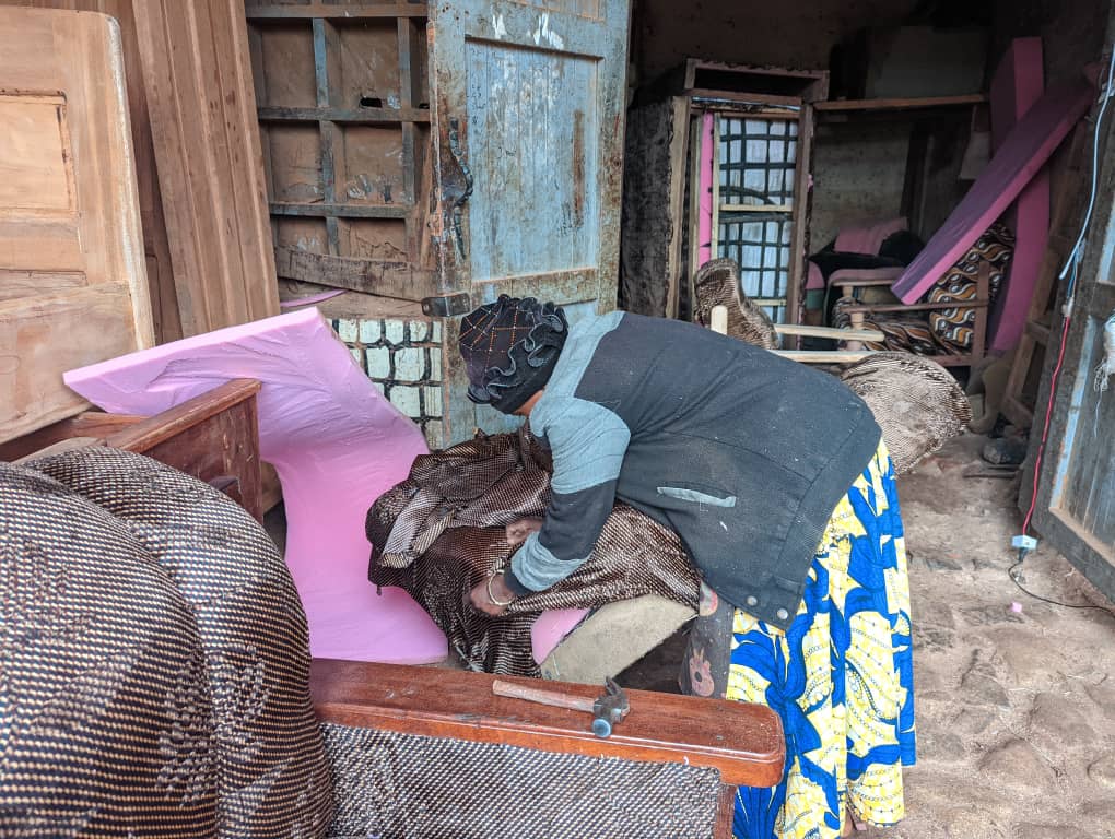 Elle exerce ce métier depuis plusieurs années. Elle travaille dans un atelier appelé “Bora Tu’ungane”, situé sur rue Kinshasa au quartier Vungi dans la commune Kimemi. Cet atelier appartient à son mari. Elle fait le garnissage des chaises, toutes les marques confondues. Elle garnit plus de trois salons chaque semaine.