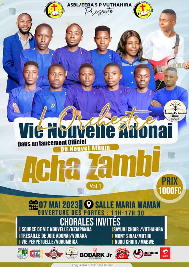 L’orchestre “Vie nouvelle Adonaï” de la Supra-paroisse de Vutahira en ville de Butembo, dans le diocèse de Butembo-Vukaka de l’Eglise évangélique du rite africain (EERA) annonce pour ce dimanche 7 mai, le lancement de son tout premier album. Il porte le titre « Acha Zambi », traduit en français « Renonces aux péchés ».