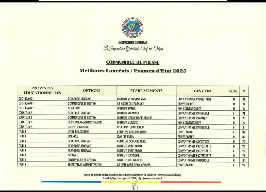 Parmi les résultats les plus remarquables, on note une performance exceptionnelle dans la province de l’Ituri 1, où une élève du complexe scolaire Okapi a atteint un taux impressionnant de 90 % en option Latin-Philosophie. En Sciences, un candidat de l’IDAP ISP Bunia a enregistré 83 %, tandis qu’en Pédagogie générale, plusieurs élèves issus d’écoles comme Saint Apolo, Collège scolaire Njiru, et Luvangie ont dépassé les 77 %.
