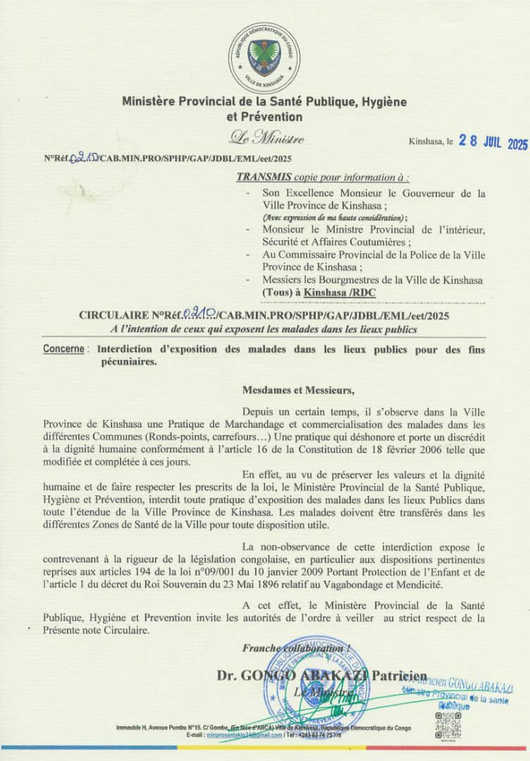 Cette pratique, écrit le ministre, porte atteinte à la dignité humaine. Il interdit formellement cette exposition publique des malades à travers toute la ville-province de Kinshasa et met en garde contre toute contrevenance à cette mesure.