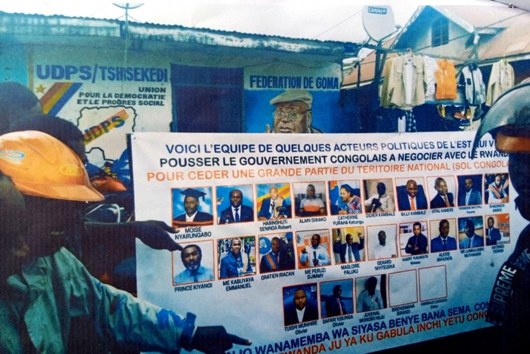 Devant le bureau de l’UDPS-Tshisekedi fédération urbaine de Goma, il est affiché un calicot reprenant les photos et les noms des députés, leaders communautaires et membres du gouvernement central de l’espace Sud, Nord-Kivu et Ituri, présentés par le parti présidentiel comme “auteurs” de la démarche visant à pousser le gouvernement congolais à négocier avec le Rwanda, et lui céder une partie du territoire congolais.