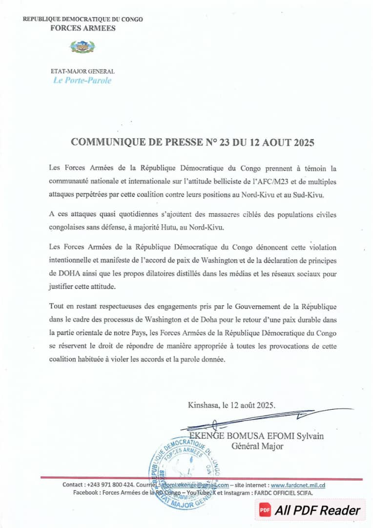 Dans un communiqué de presse du 12 août 2025 émanant de son porte-parole, le Général Major Ekenge Bomusa Sylvain, l’armée congolaise fait part de l’attitude belliciste de l’AFC/M23 et de multiples attaques perpétrées par cette coalition contre ses positions au Nord et Sud-Kivu ainsi que des massacres qui ciblent des populations civiles sans défense, dont la plupart appartiennent à la communauté Hutu au Nord-Kivu.